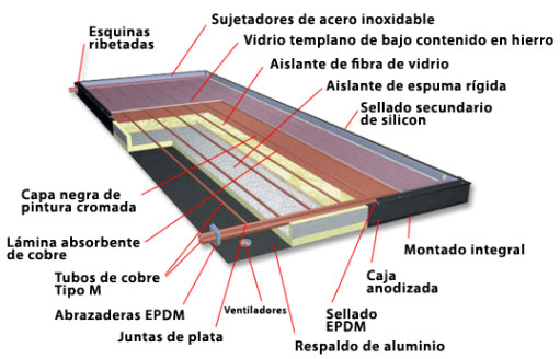 Los colectores planos consisten en una caja plana metálica por la que circula un fluido, que se calienta a su paso por el panel. Puede ser a su vez: