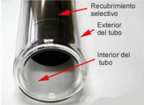 Para poder aprovechar la energía solar, la superficie externa del tubo de vidrio interior se cubre con una capa altamente selectiva y no contaminante, concebida así como un absorbedor. Este recubrimiento se encuentra por lo tanto protegido en el espacio vacío intermedio. Se trata de una capa rociada de nitrito de aluminio que se caracteriza por su ínfima emisión y una óptima capacidad de absorción.¿Por qué el vacío? El vacío es un excelente aislante. Las propiedades de aislamiento son muy buenas, si el interior del tubo esta a muy alta temperatura, el tubo exterior es frío al tacto. Los tubos de vacío funcionan bien incluso en climas fríos cuando colectores planos funcionan mal debido a la pérdida de calor.