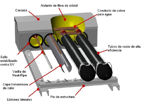 El tubo de vacío es un óptimo producto en cuanto a potencia y geometría. Los tubos se estructuran en dos tubos de vidrio concéntricos que en un lado se cierran en forma de media esfera y en el otro lado se fusionan entre sí. El espacio intermedio entre los tubos se evacúa y finalmente se cierra de forma hermética (aislamiento mediante vacío). Es decir, un tubo de vacío solar es un tubo formado por dos cristales concéntricos de borosilicato entre los cuales se ha hecho el vacío. El tubo exterior es transparente y deja pasar los rayos solares al tubo interior, que los absorbe de una forma muy eficiente. Dentro del tubo interior está el líquido a calentar o bien un tubo de cobre heat pipe.