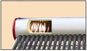 Flujo indirecto pasivo Close Loop: El funcionamiento base es igual al anterior. EL agua de intercambio de calor se encuentra en el circuito primario, dentro de los tubos de vacío y el estanque. Dentro del estanque se encuentra el intercambiador de calor en forma de serpentín de cobre. Al interior del serpentín circula agua de consumo, esta entra a temperatura de la red y sale con un aumento de la temperatura para consumo. O sea, el agua caliente del estanque transmite el calor al agua que circula por el serpentín de cobre, y esta agua que circula por el serpentín de cobre está a la presión de la red.