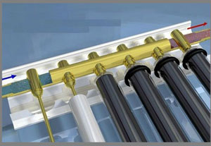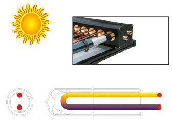 La radiación solar penetra el tubo exterior de cristal y es capturada en el exterior del tubo de cristal interior por una capa difusora altamente selectiva. La captación de radiación solar es transmitida hacia una aleta de aluminio de contacto superficial y desde ésta hacia la tubería de cobre que contiene el fluido caloportador.