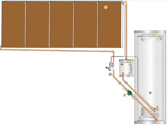 El tanque trae incorporado en su interior un serpentín de cobre, o bien el intercambio de calor también se puede hacer fuera del estanque con un intercambiador de placas. A este sistema también se le deben agregar sistemas de seguridad para evitar sobre calentamientos y congelación, lo que hará más sensible la instalación por el aumento de partes y piezas como son las válvulas de seguridad por presión y temperatura, purgadores, vasos de expansión.