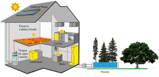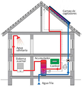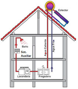 Esquema: Sistema solar térmico integral en una vivienda tipo