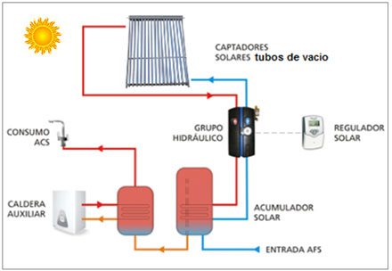 Los colectores solares de tubo de vacío son el resultado de la aplicación de la más alta tecnología en el diseño, fabricación y selección de materiales, con el fin de obtener una elevada eficiencia en la entrega de agua calentada por energía solar.El tubo de vacío supone una evolución respecto a los captadores convencionales, al sustituir los materiales aislantes, como Lana de Roca, cuya misión es preservar el calor en el interior del captador, por vacío, los que no sufre ningún tipo de pérdidas por degradación durante su vida útil. Su alto rendimiento se refleja en que es capaz de asegurar rendimiento en días de invierno, nubosos e incluso con lluvia, condiciones donde superan con creces a los antiguos paneles planos.